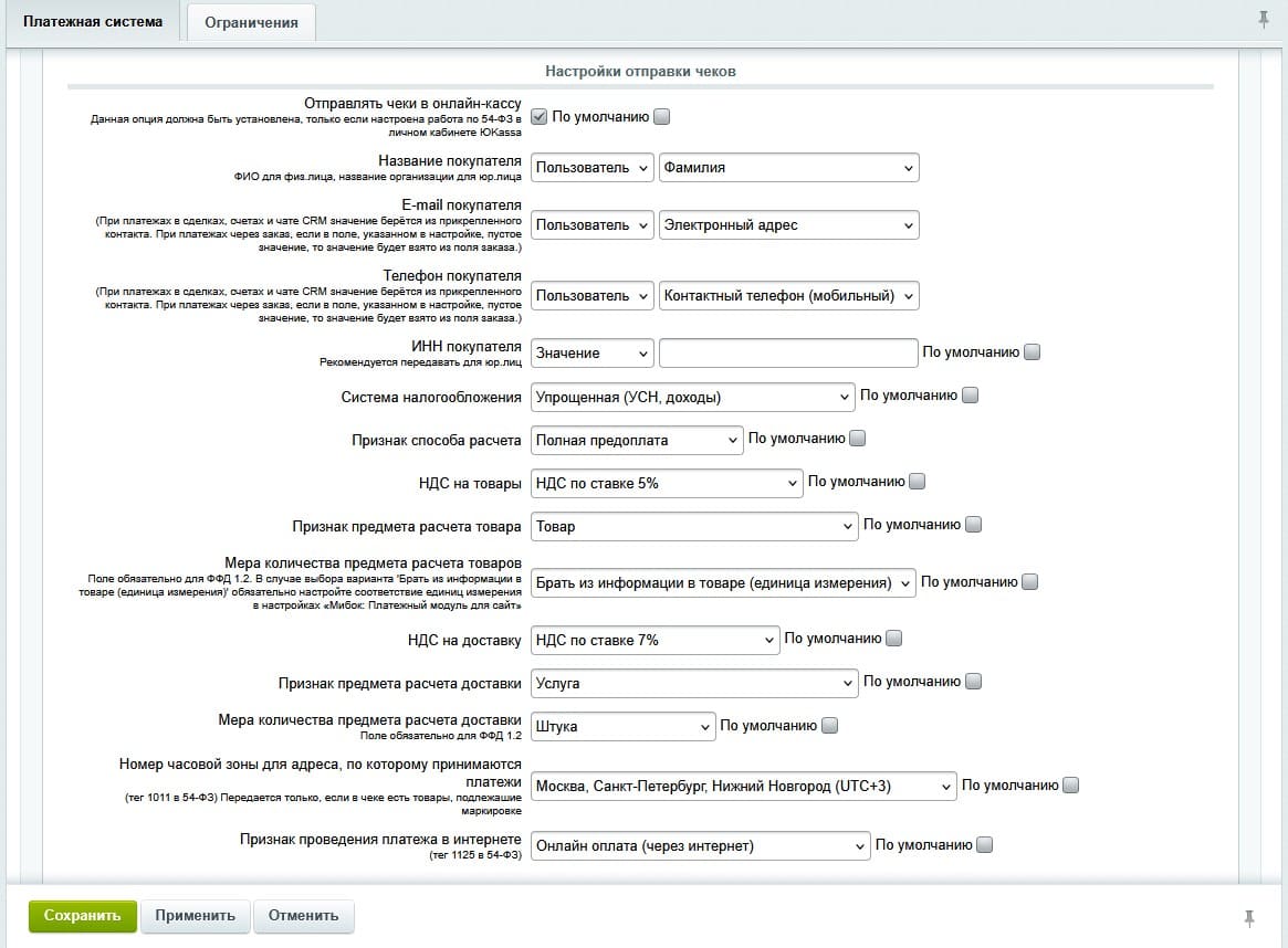 Обратите внимание, если у Вас осуществляется оплата через платежную систему и оформление заказа с использованием модуля sale, рекомендуется отправлять чеки зачета предоплаты в автоматическом режиме.